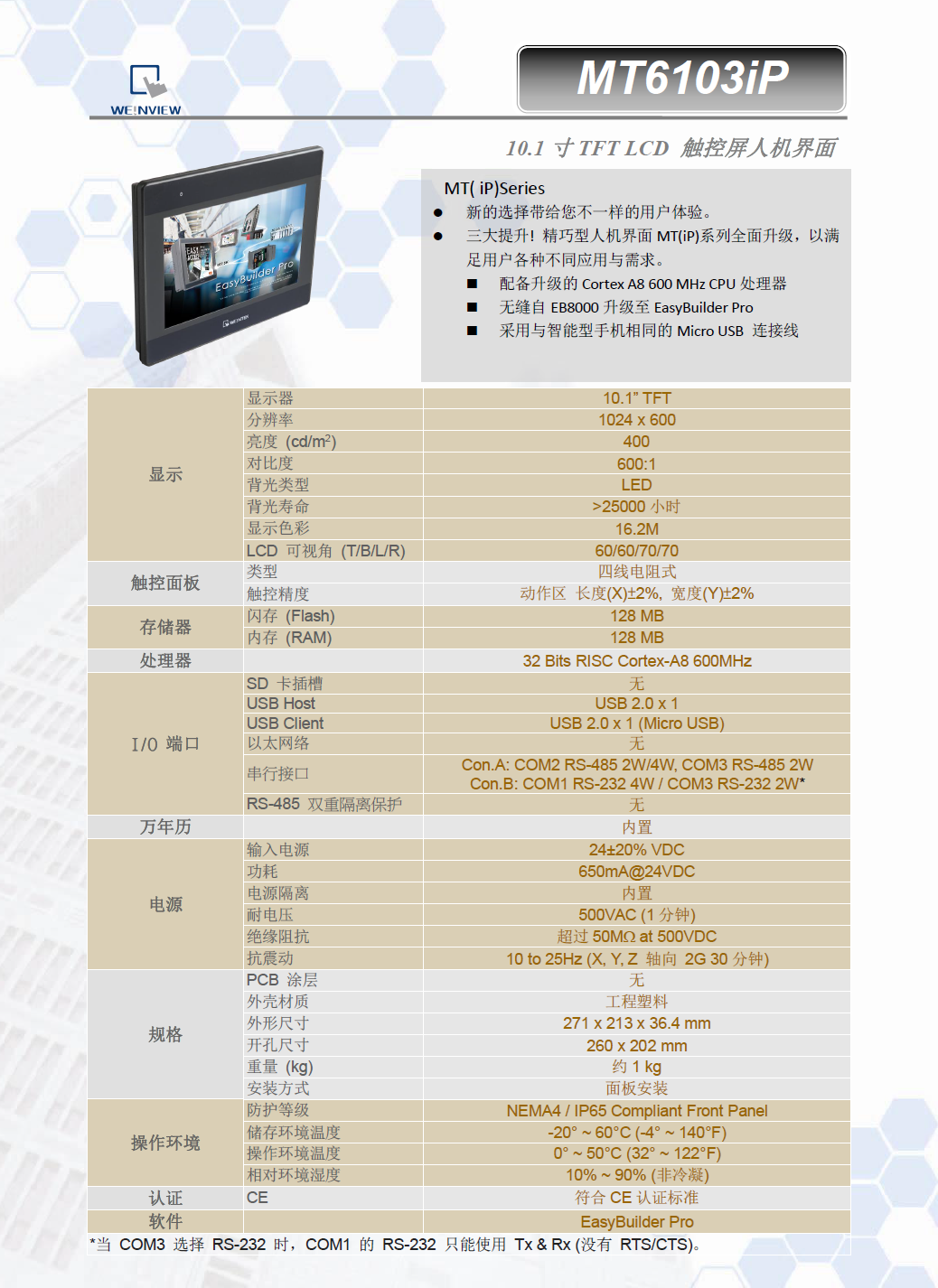 10.1' 1024 x 600 TFT LCD, LED 背光